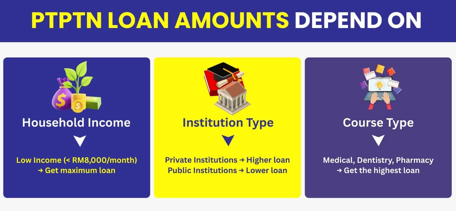 - Public Institutions (IPTA) → Lower loan amounts (tuition is subsidized)