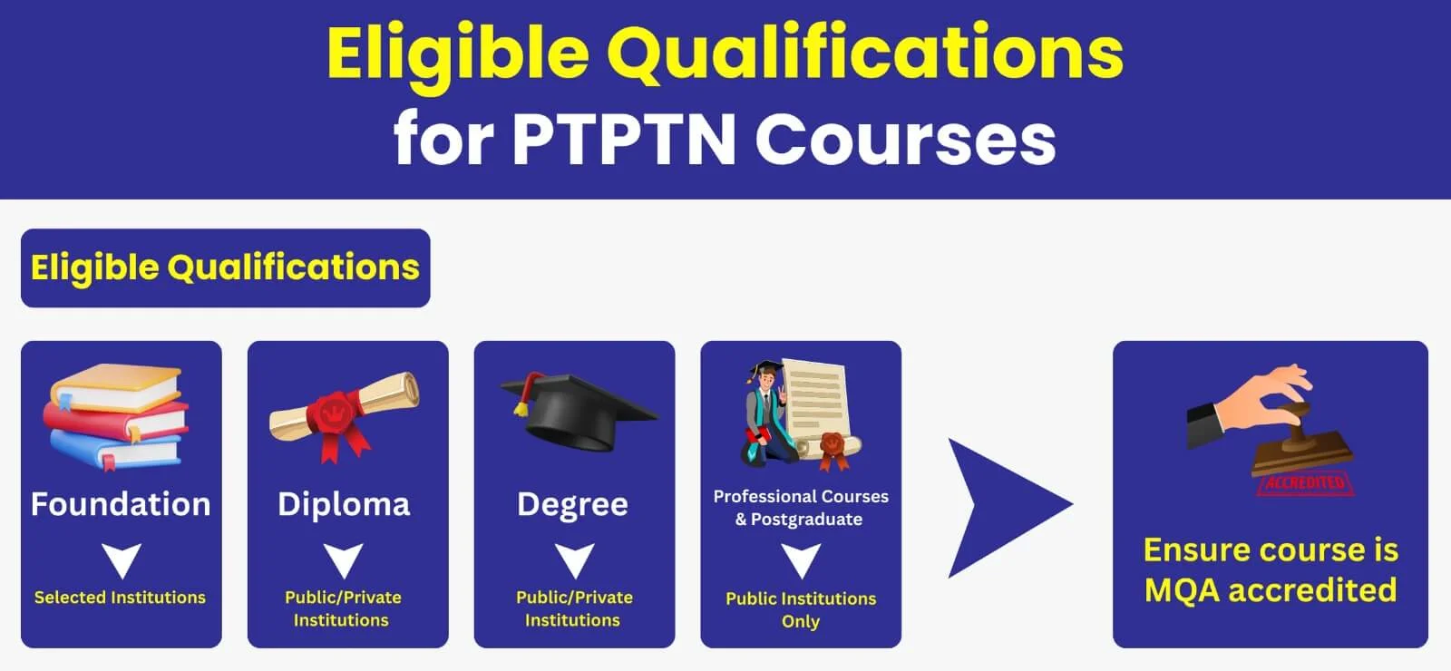Here is a quick overview of eligible qualfications and instituitions for PTPTN Loan in Malaysia